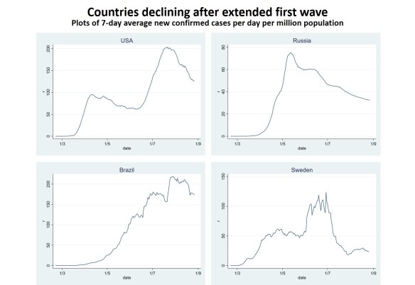The last figure shows four countries who have had an extended first wave, now declining, and may or may not yet have a second wave. It is no coincidence that three of the four countries in this category – Brazil, Russia and the USA – are led by far-right nationalists who use technology as a tool for disinformation, demonize minorities and ignore climate change. Sweden was one of the few European countries not to impose a compulsory lockdown and has had a much more extended epidemic as a result. It did ban gatherings of more than 50 people, but other measures were voluntary. Though I saw a post from a Swedish man recently, saying he was having a lot of trouble coping with the social distancing of 2 metres and asking how soon he could go back to his usual social distance of 5 metres. I haven’t classified the USA has having two waves, because the first small plateau resulted from the peaking and decline of the epidemic in New York largely, while transmission continued to increase rapidly elsewhere, particularly in the South. I came across an article today that described the USA as suffering from twin pandemics: covid-19 and stupidity.