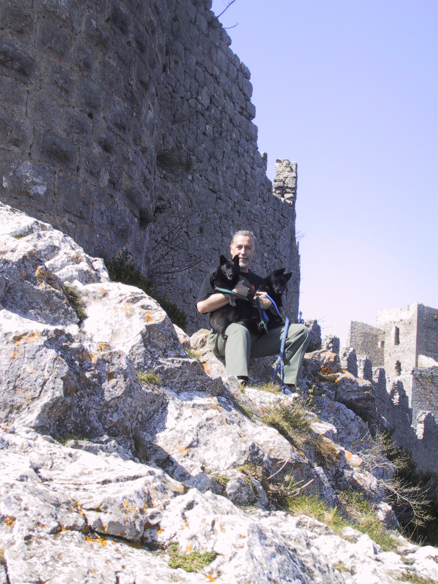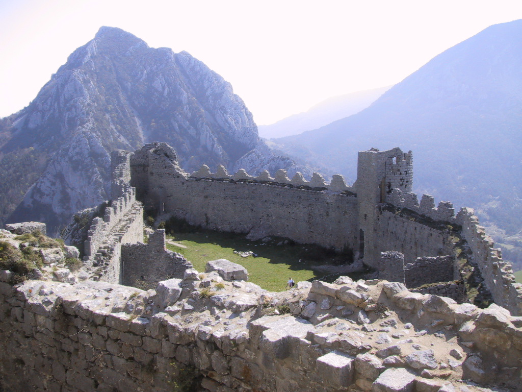 One of the “five sons of Carcassonne”, Puilaurens stands on an outcrop of rocks not far from the gorges of the Pierre-Lys. The only access is by a zigzag path up a narrow natural corridor. The keep at the Western end overlooks the path up to a large gateway. The walls follow the irregular shape of the rock and you can climb up to the battlements at one point, to look out across the valley to the surrounding mountains.