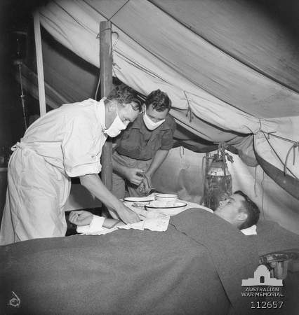 Sergeant Keith Stanleigh Clark (middle) assisting in a field ambulance blood transfusion, Balikpapan, Borneo, 3 August 1945.