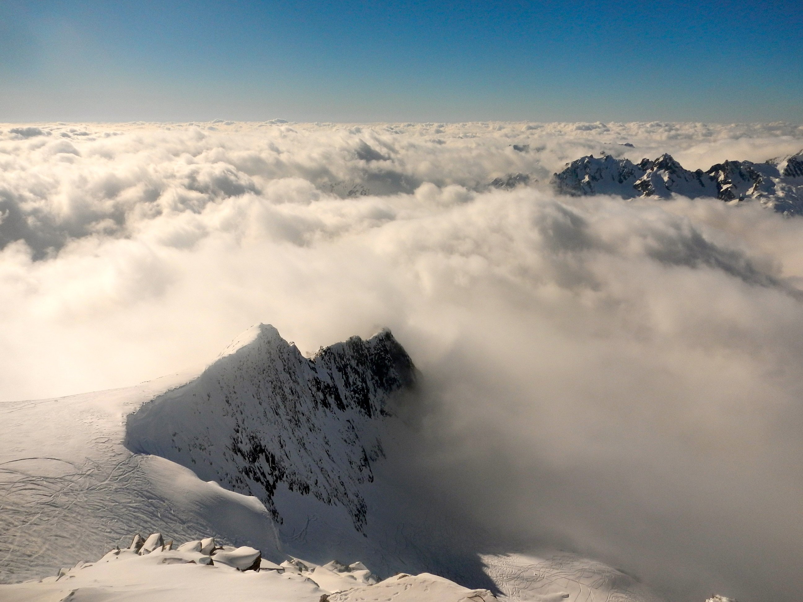 I went back up to the top after lunch and the clouds were coming in – below Mont Blanc. Towards the bottom of the photo below, some skiers can be seen, heading off the other side from where I was going.