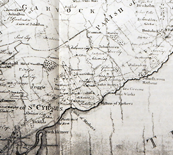 While there is real evidence that the Mathers of Scottish ancestry originally came from the Mathers villages, I find it nice to imagine that they did. As I was in Scotland for meetings after Easter, I took a few extra days and visited the Kaim of Mathers and the Mathers villages. I stayed in the Old Fishing Station in the St Cyrus Nature Reserve and found a history of the district in my room, a book first published in 1970 by Duncan Fraser (Duncan Fraser. St Cyrus: Portait of a Parish. Montrose: Standard Press; 1979). Much of the information below is paraphrased from this book, which I thoroughly enjoyed reading while I was there. Below is a copy of a survey map from 1774 showing the villages of East Mathers, West Mathers, Milton of Mathers and Miltonhaven.