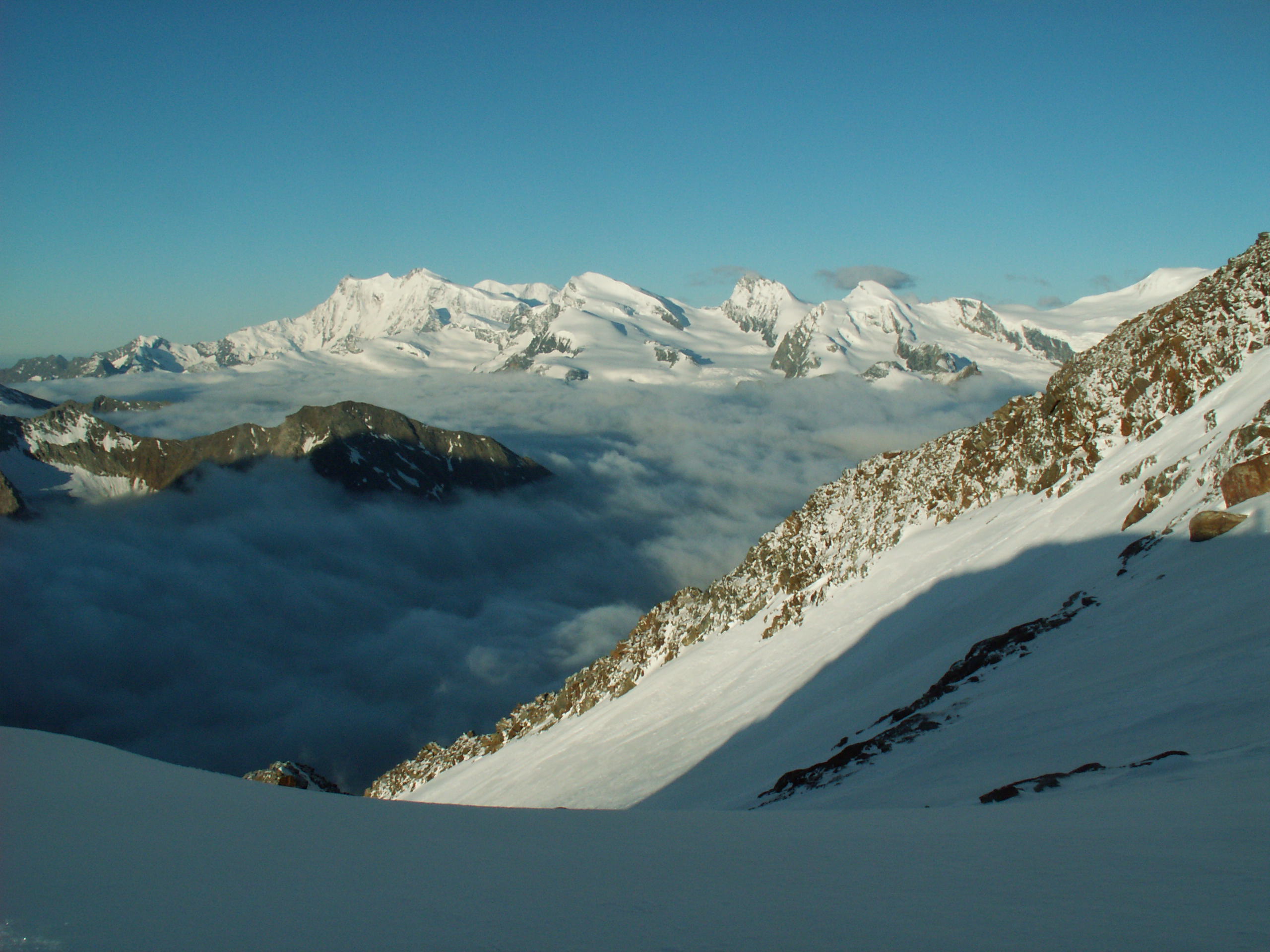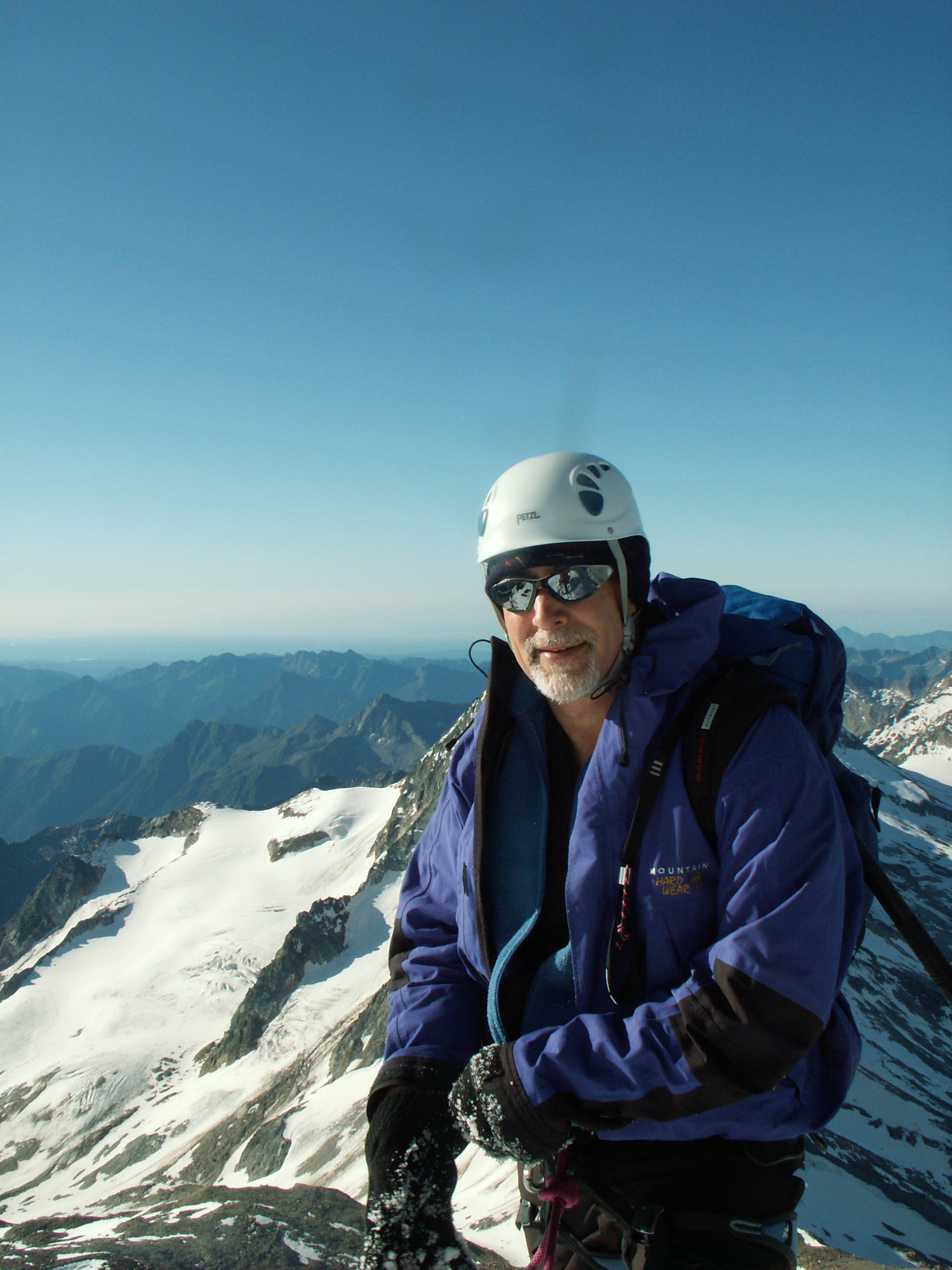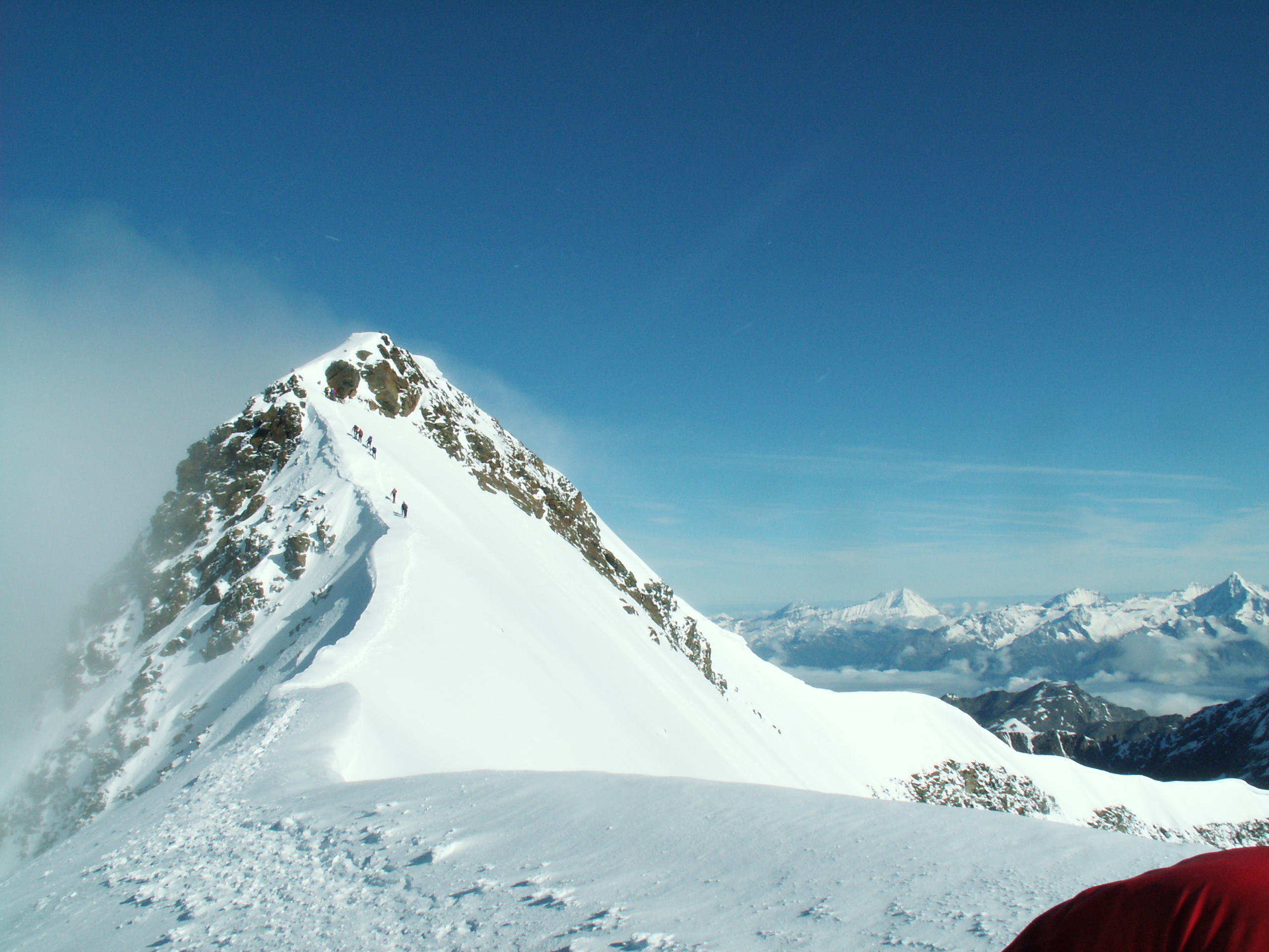 After many years since I had last been climbing on high mountains (Mt Kenya long ago, plus some easy peaks in Britain, Norway and Italy), I decided in 2007 I should do an alpine trip seeing as I was living here in Switzerland. So I contacted a guide and he suggested we climb Weissmies. At 4023 m, Weissmeis is the western-most 4000m peak of its range near Saas Fe (not far from Zermatt).