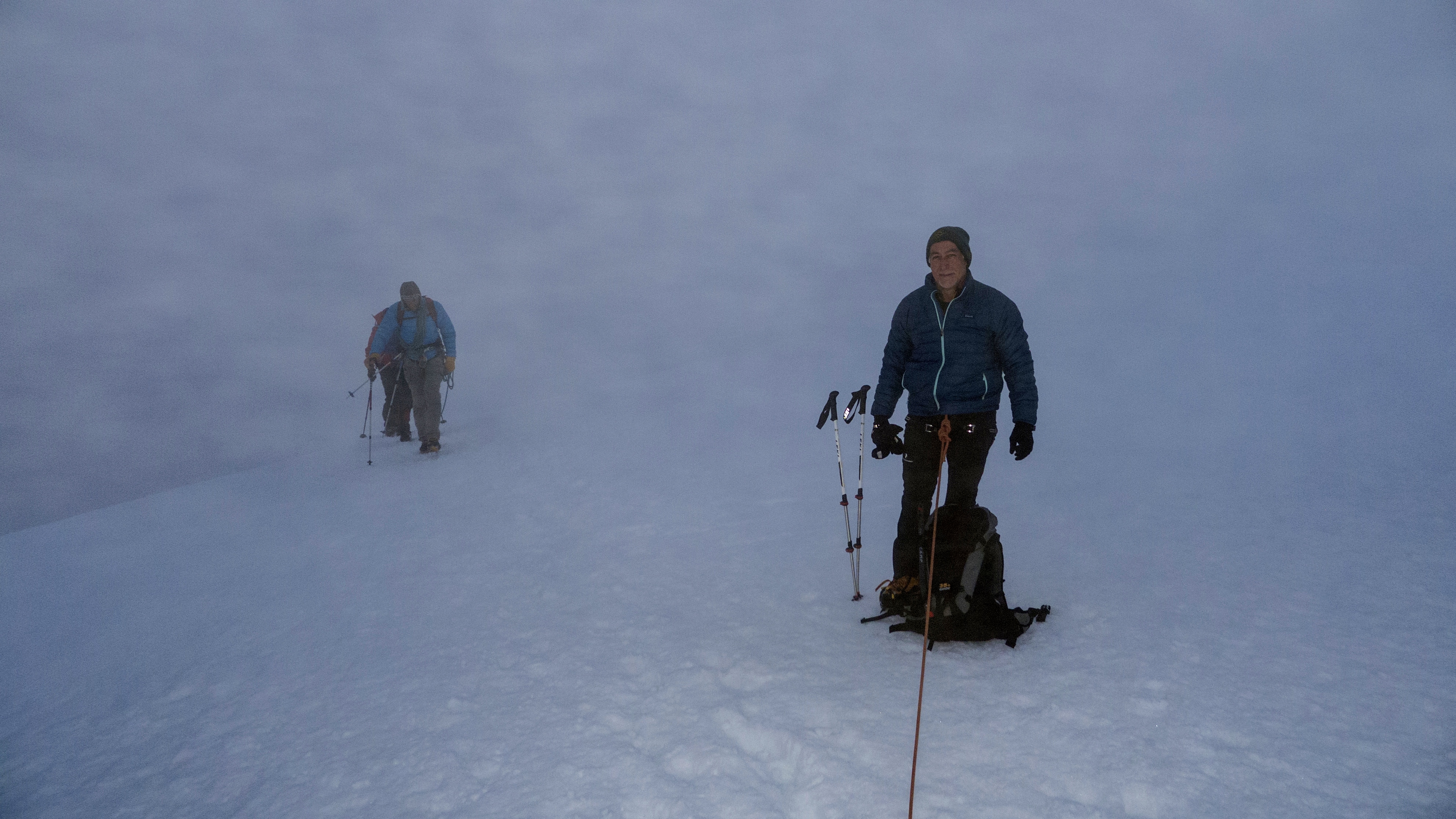 Roped together, we established a good rhythm and made a steady ascent on the glacier, steep at times, and were soon enough in the clouds with relatively low visibility (perhaps 10 to 20 m). At times there were breaks in the cloud and we caught glimpses of the surrounding peaks and the Alps in the distance to the north, as the sky gradually lightened towards dawn.