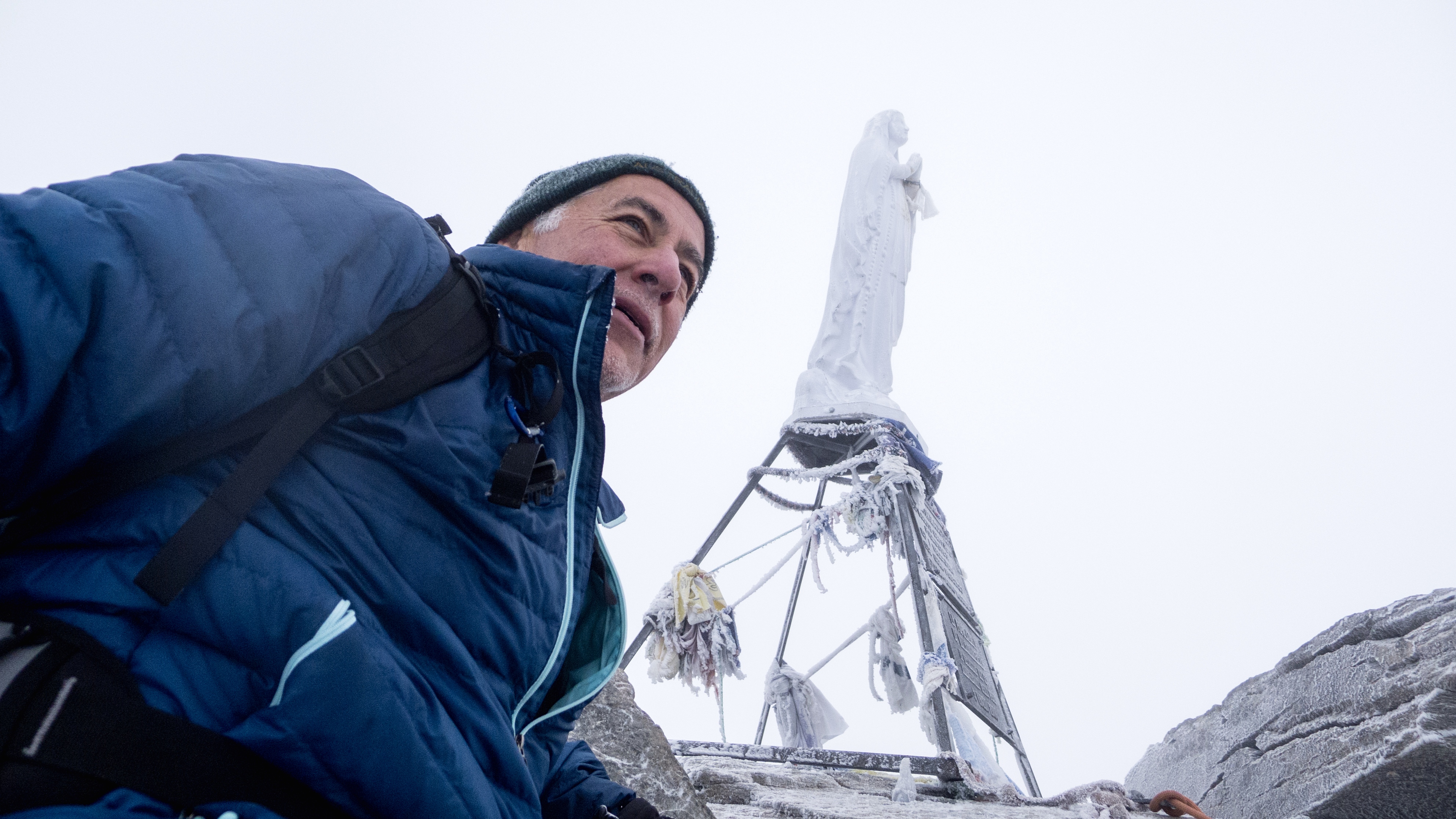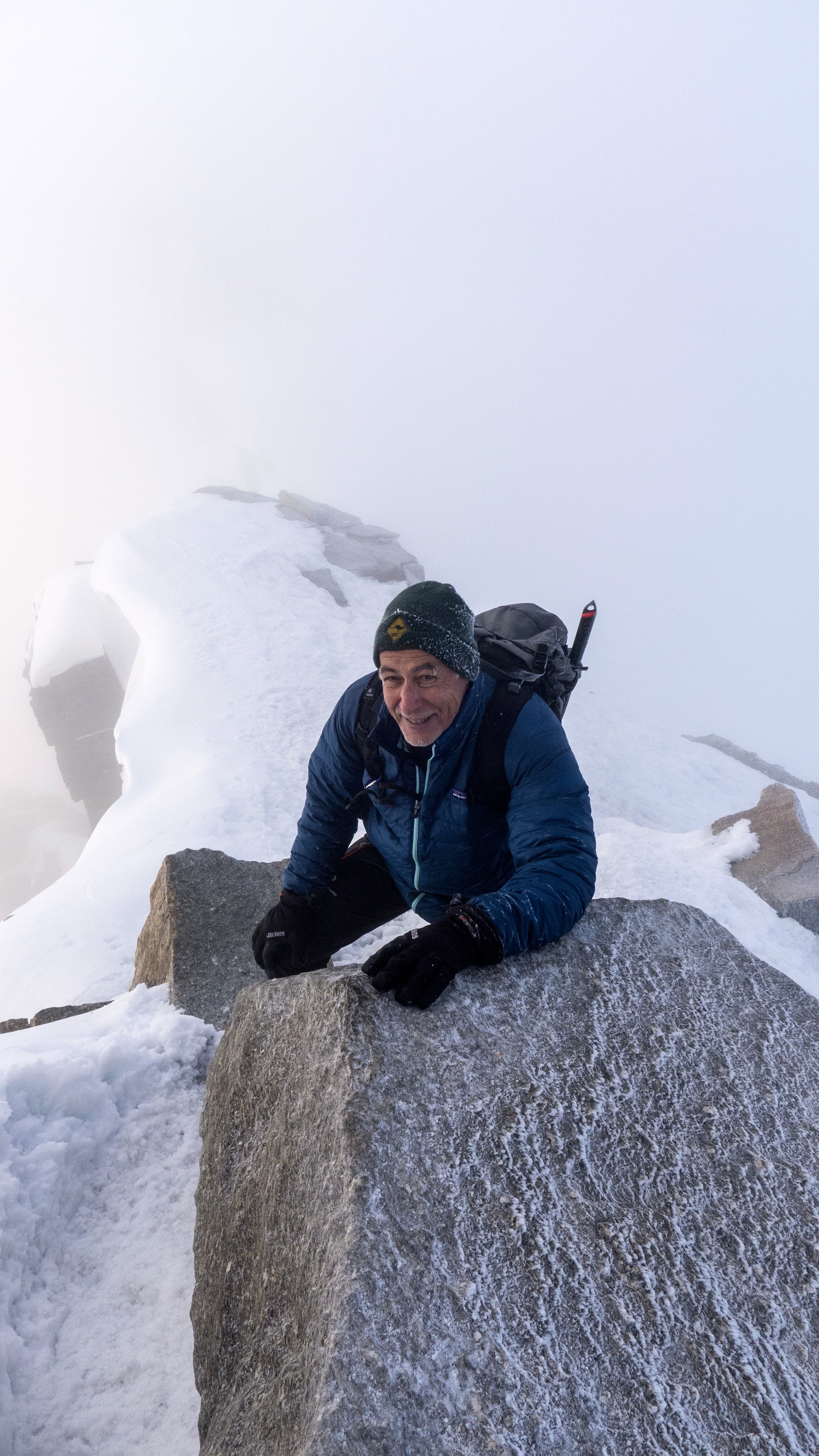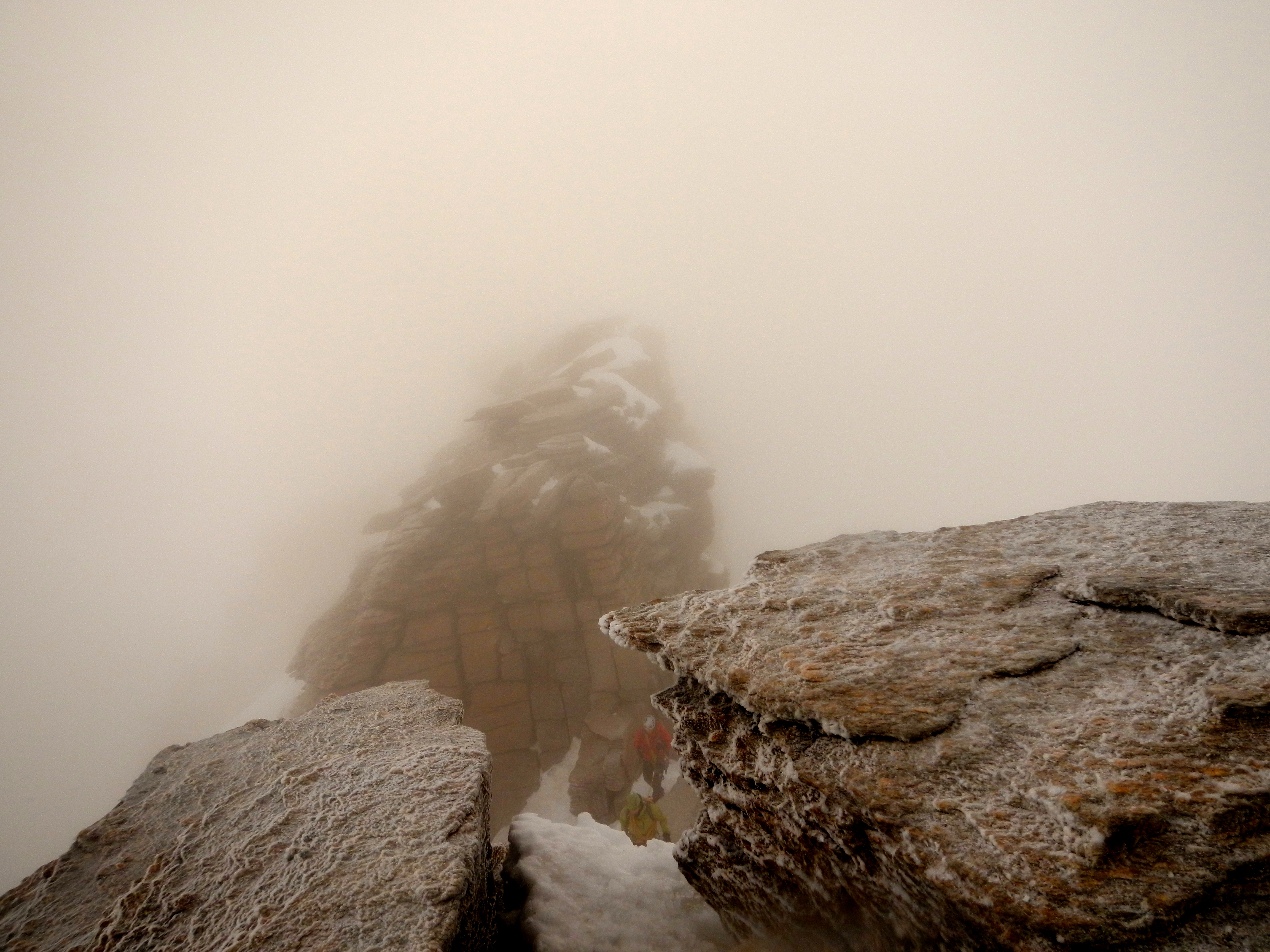 The summit ridge presents an exposed but relatively easy scramble to the summit. However, the visibility was again low and there was a wind blowing that was very cold. I was wearing my thin goretex gloves, and the fingers of my right hand had started to get painfully cold. We climbed up and along the rocky outcrops of the summit ridge, mostly moving together roped, but in a few places using some metal bolts in place to set up belays. The “crux” was a short ledge on the vertical side of a block of rock. It was about boot width and there was a convenient crack at chest height for handholds, however, there was a substantial amount of air below my feet.