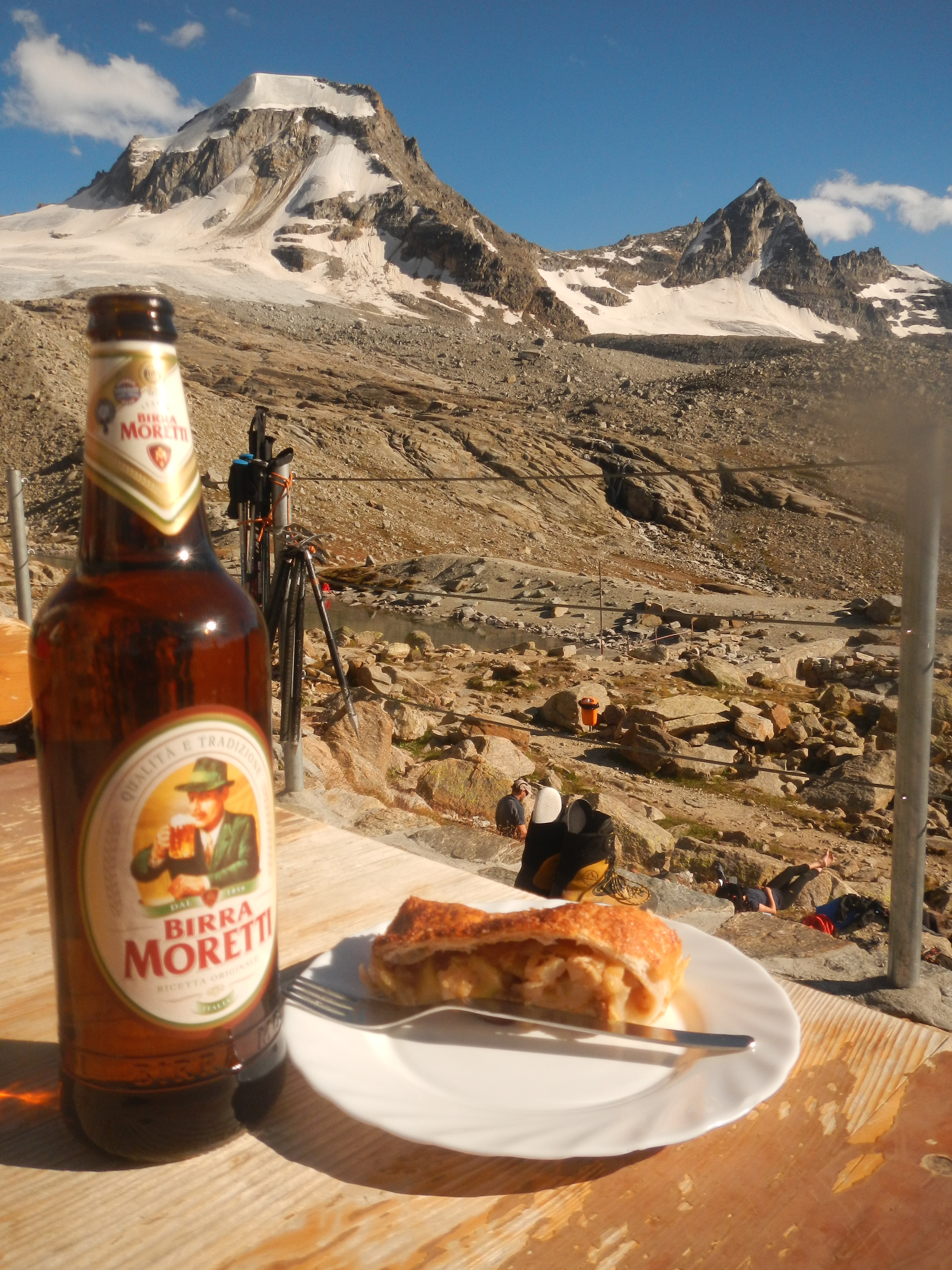 After arriving at the hut and enjoying some local refreshments, Yannick had a nap and I found a quiet spot to do some sunbaking and relaxing. After dinner at 7 pm, with that essential pasta for ‘carbo-loading’ for the next day, and several glasses of a very nice Barbarossa red wine, we settled down for an early night.