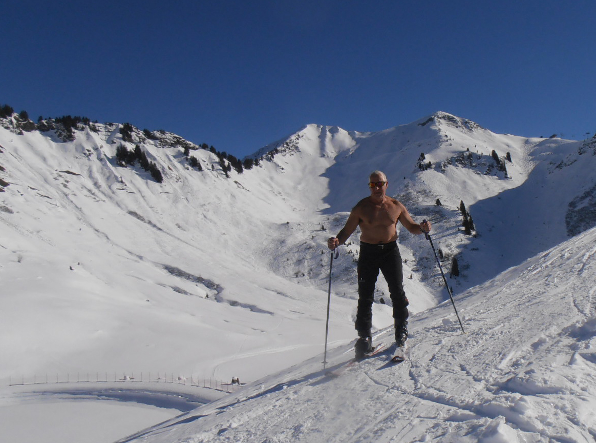 In the following days it got quite hot and we progressively shed layers, until later in the week we were for a time skiing in t-shirts. And for a short period, with even less.
