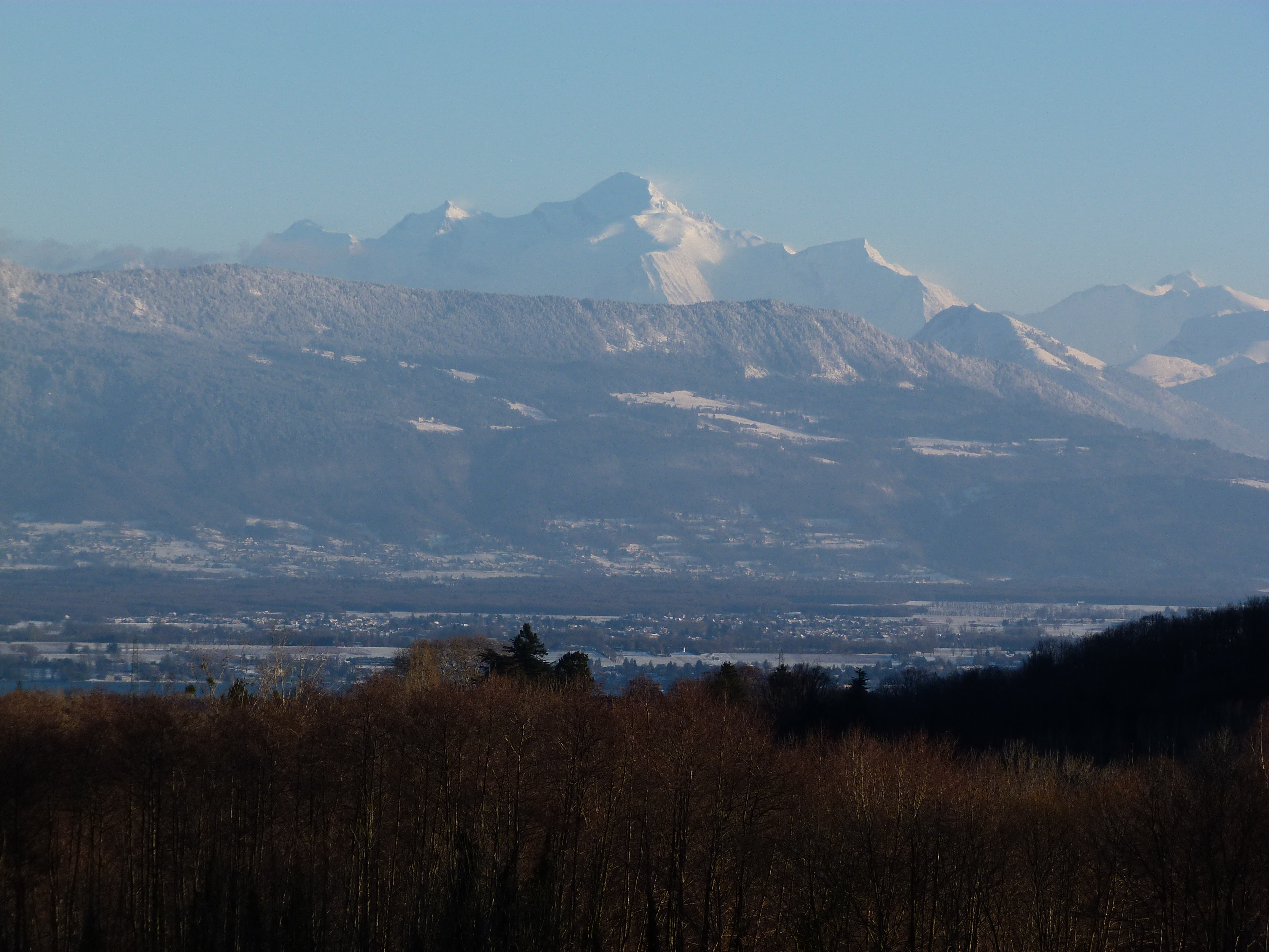 Yannick decided that we would attempt the Gouter Ridge route, to avoid a potential avalanche risk that he had seen on a previous trip via the Three Mont Blancs route, due to dangerously overhanging seracs. The Gouter Ridge route is the most direct route, but involves an ascent of the Gouter Ridge where there is quite a danger from rock falls. Yannick planned to minimize this risk by staying at the Tete Rousse hut at the base of the Ridge, and climbing it in the dark before dawn, stopping for a break at the Gouter Hut at the top of the ridge, before heading to the summit. The route is visible in the photo below, that I took in December 2010 from near Divonne. The line between the sun and shadow is pretty much the route that we took.