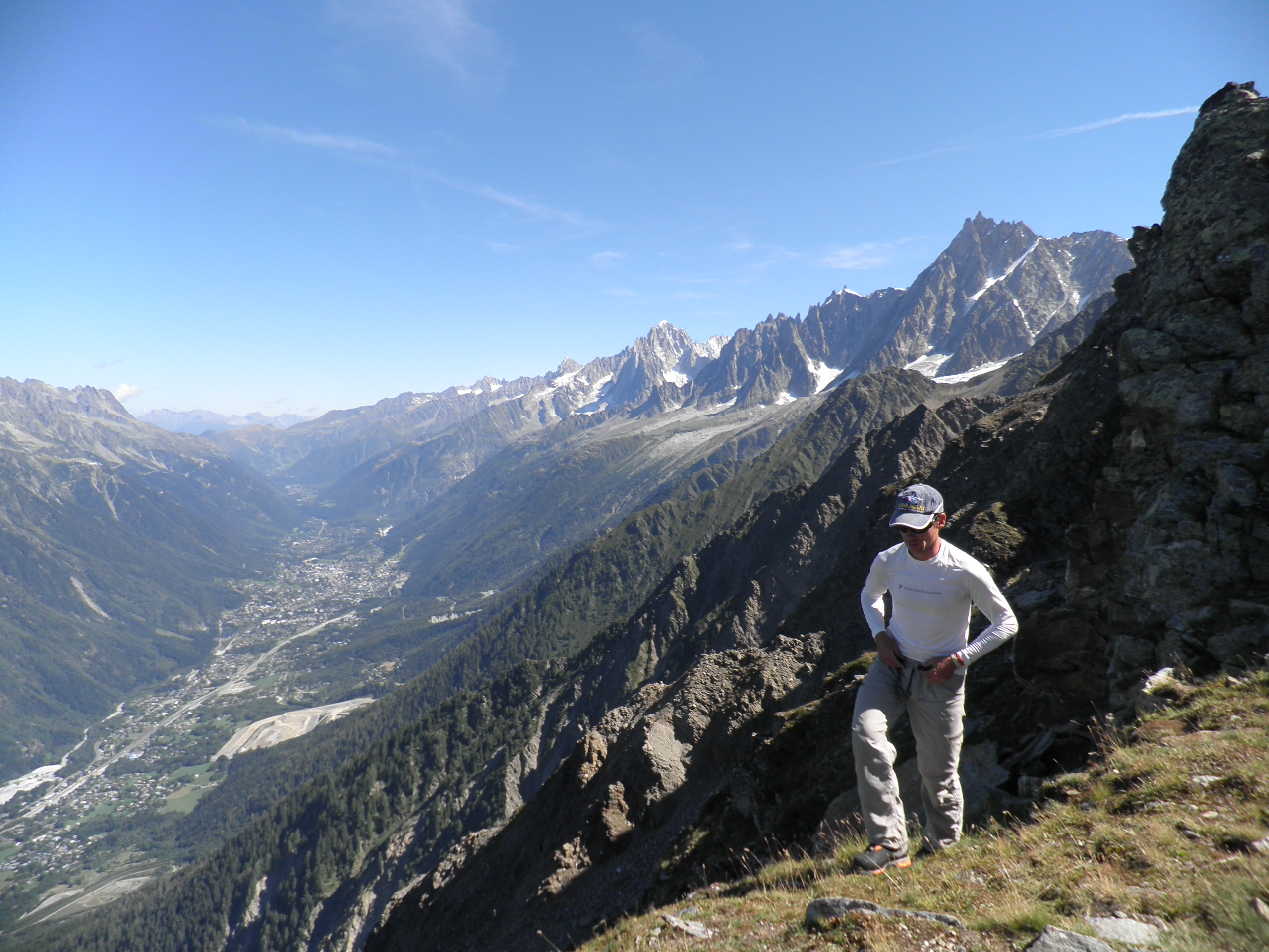 We set off on Saturday morning, catching Tramway du Mont Blanc from Les Houches partway up the foothills, and then walking up about 800m to the Refuge. Below is Yannick on the ridge leading up to Tete Rousse refuge, with Chamonix in the valley below.