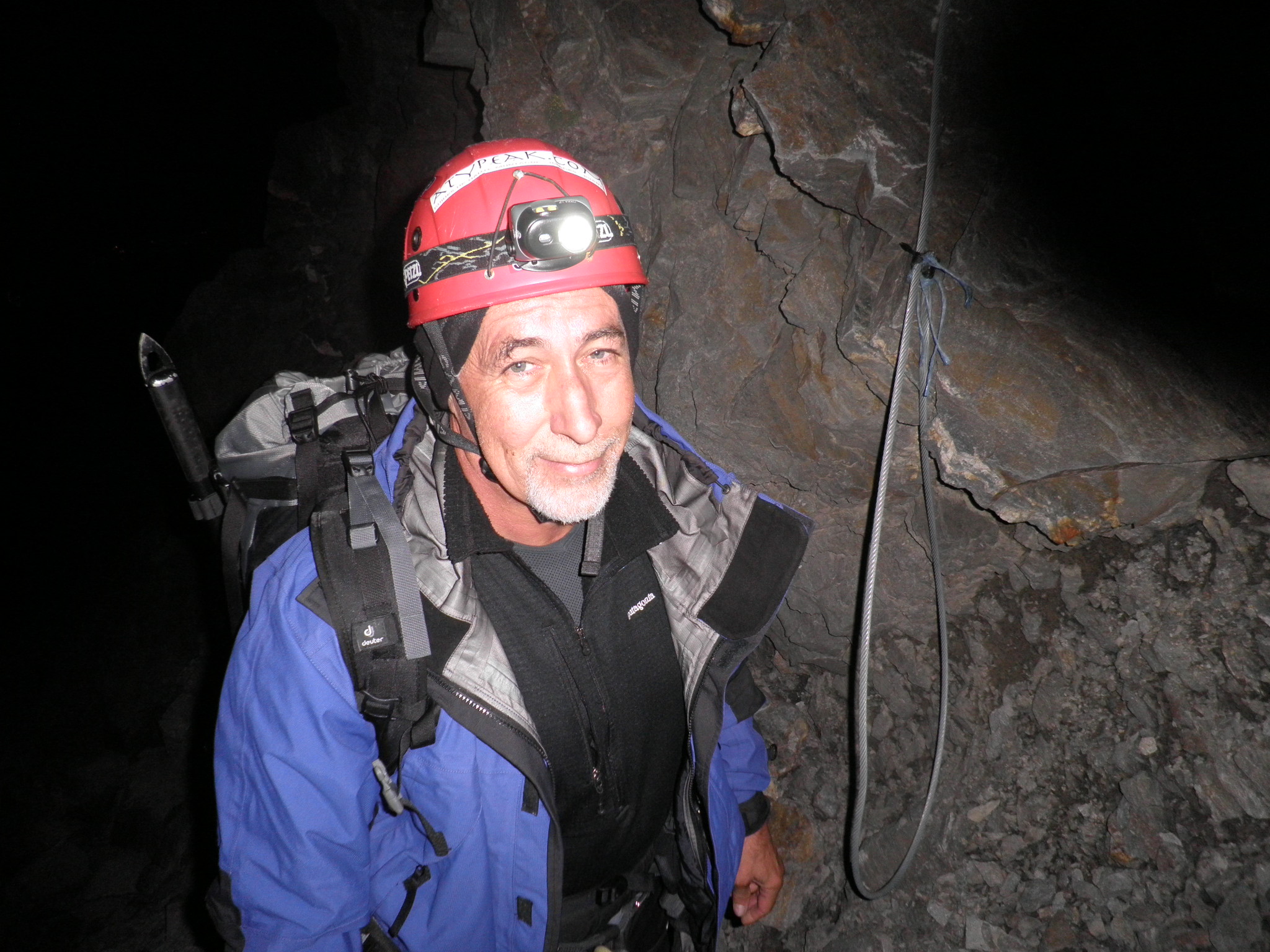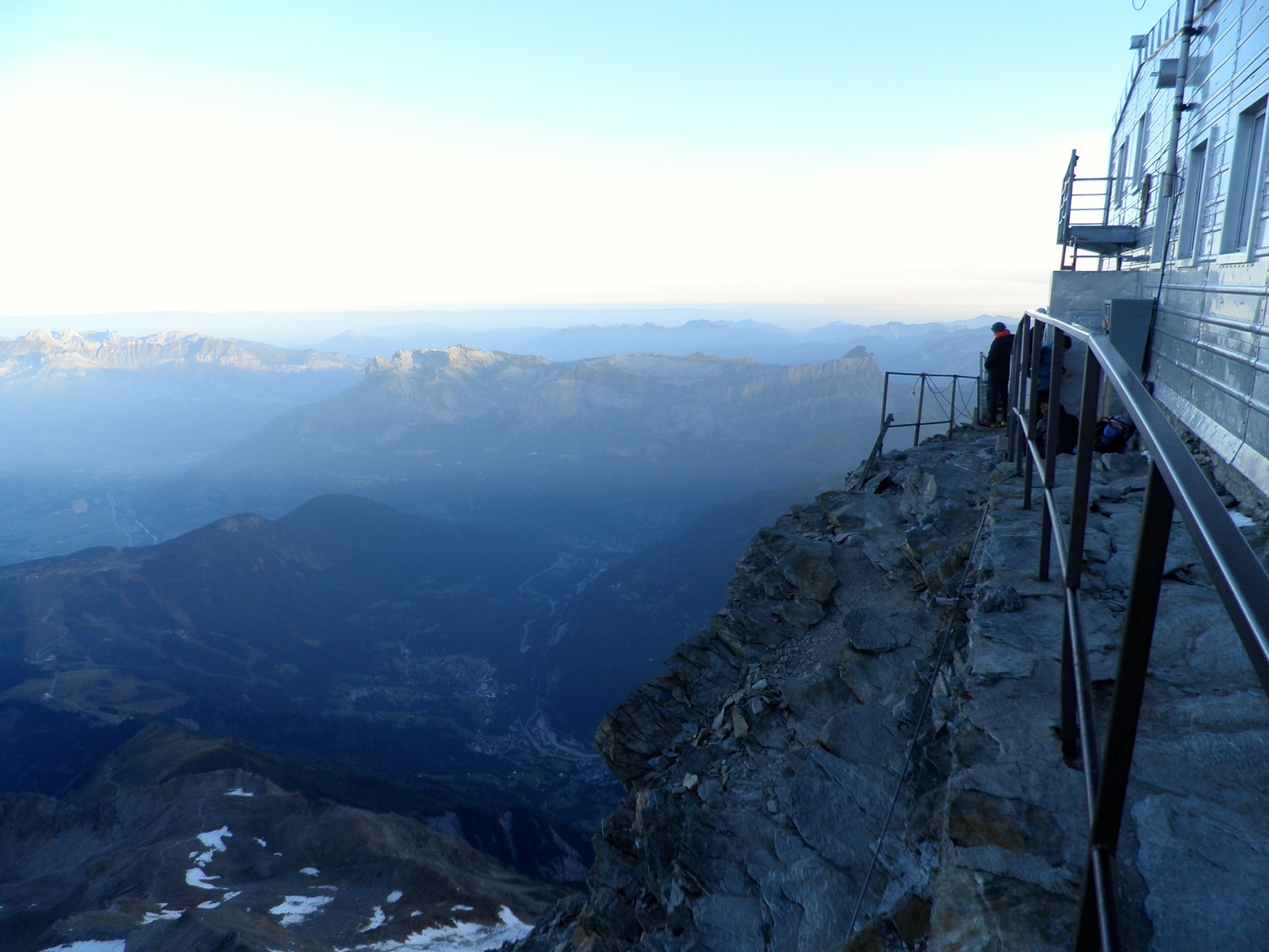 In fact, the climbing by headlight was quite straightforward, particularly as the headlamps did not really illuminate the exposure. After two hour climb in the dark, we reached the Gouter Refuge (3817 m) and had an hours rest. The top part of the climb was steep, almost rock climbing, and some cables were strung for assistance and for belaying. The top of the last cable is visible in this photo and is on the start of the route down.