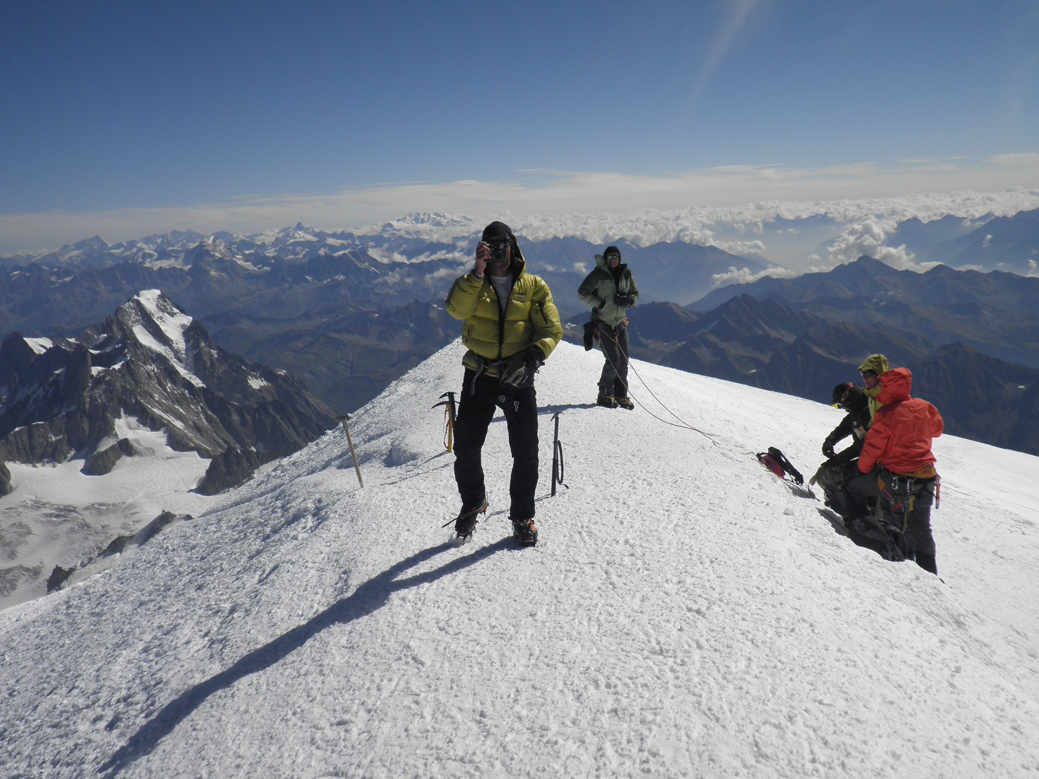 It took us four hours from the Gouter hut, and we reached the top at 11.30 am on Sunday, 5 September 2010. I had expected it to be hard, but it was still harder than I expected! And it was perfect weather, with unbelievable views. I was exhausted. But conditions were great with no wind, and after 10 minutes or so rest plus a drink and snack, I was feeling much better.