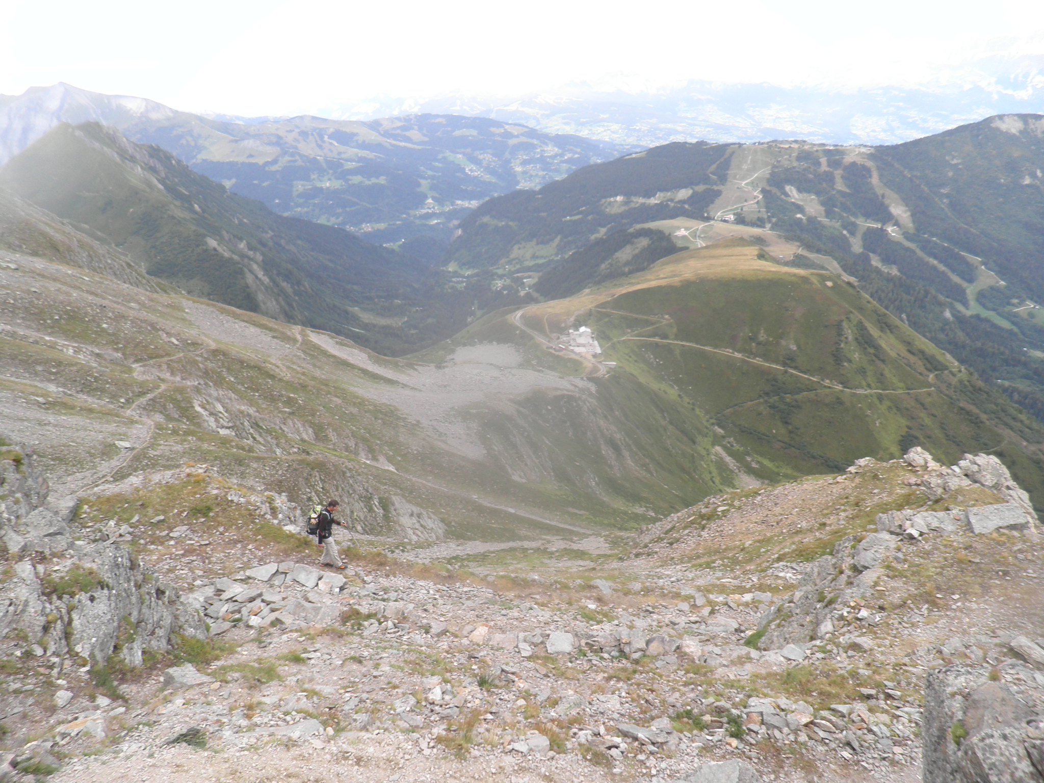 We stayed Sunday night at Tete Rousse refuge again. The next morning we slept in till 7 am and dropped another 1000 m down Les Rognes ridge to the middle station of a tramway which connected to a cable car, and back down to the valley (photo below). The ridge was quite exposed in one place and we roped up again for it.