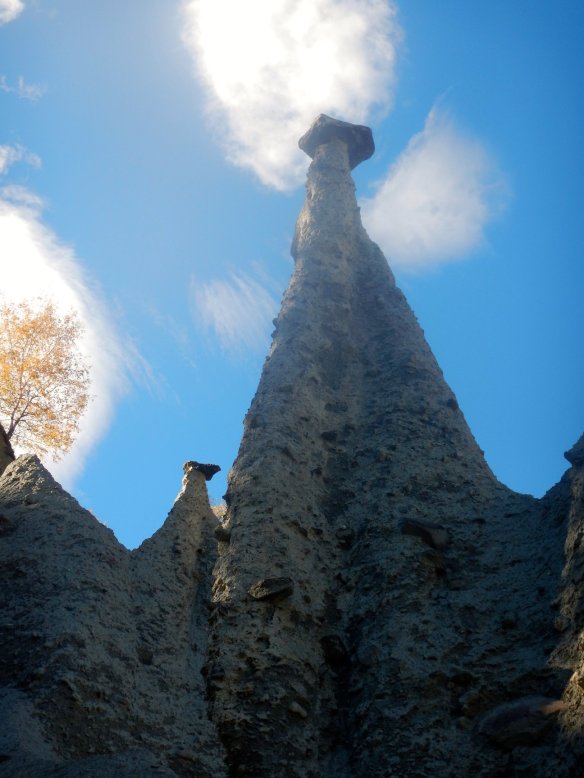 The Pyramids are the remnants of a ground moraine created from finely ground silt and sand with embedded larger boulders. Some of the boulders protected the underlying compacted silt from erosion, forming protective caps.