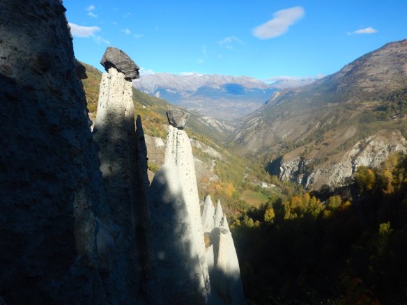 The pyramids form a line down to the river at the bottom of the valley. In the distance about 12 km away is the Rhone Valley. Turn left and it is about an hour and half drive to Geneva on the motorway.