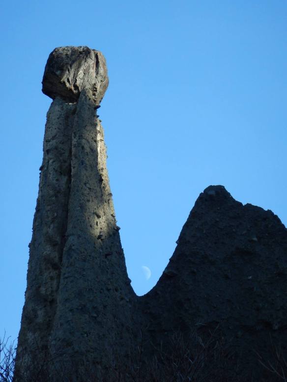 The glaciers retreated around 11,000 years ago. These capstones have been sitting there for a long time. Heavy rainfall in big storms caused a number of landslides and undercutting of some of the towers in January this year. They may not be around for much longer.