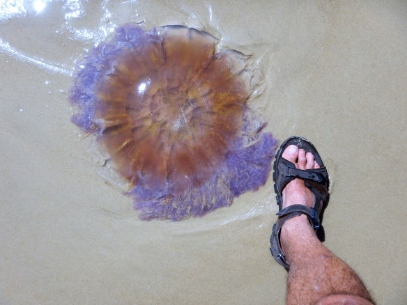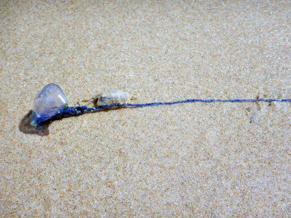 Blue bottles are common on Australian beaches and are a small cousin of the Portuguese Man-O-War. They are siphonophores and are actually a colony of several individuals known as “persons”. They have an irritating sting. I met a person on the beach who claimed to be Australian, but did not know what they were and was afraid to go in the water. I was suspicious that an Australian of middle age could exist who did not know about blue bottles.