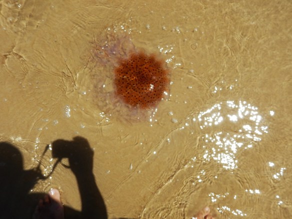 There were quite a number of these large brown jellyfish washed up on the beach. I haven’t been able to identify them, and not sure if they differ from the blue blubber jellyfish in the following photo, because they have eaten brown algae.