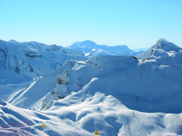 Le Pas de Chavanette is a particularly difficult piste also know as the “Mur Suisse” or the “Swiss Wall”. It starts on the border and is 1 kilometre in length with a vertical drop of 331 metres, starting at 2,151 metres above sea level. It can be partly seen to the lower left in the photo below covered in moguls and lying behind the ridge near the middle of the photo. Apart from the moguls which grow to the size of small cars, the average slope is 40 degrees, reaching 50 degrees in some parts, and a fall can mean the skier may fall hundreds of metres. It is considered one of the hardest pistes in the world.
