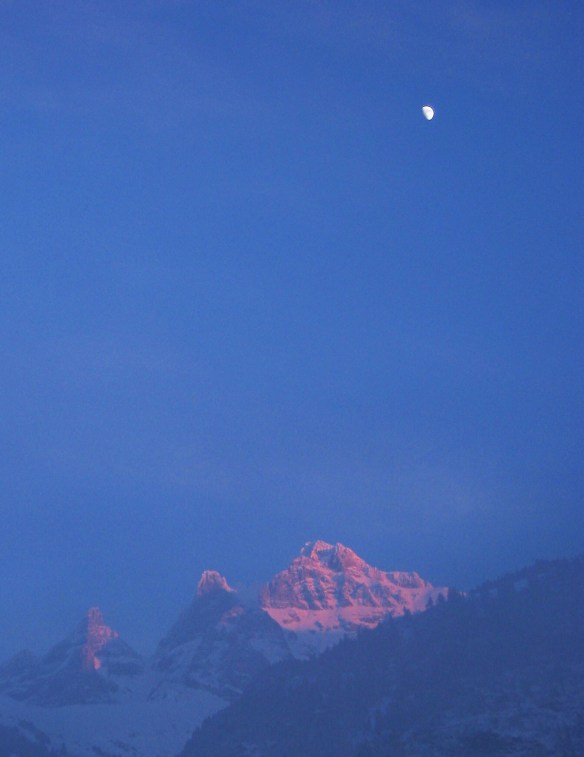 By the time we reached the valley floor, the last rays of the sun were illuminating the peaks of the Dents du Midi and the moon was shining above them.