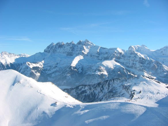 I have recently been cleaning up old external drives that I’ve used over the years for backups and found a folder of photographs from a 2003 ski trip to Champèry. Champéry lies in a side valley of the Rhone valley under the Dents du Midi (“Teeth of Midday”) mountain range. Some of the photos really capture the beauty of skiing in this region, which is part of the Portes du Soleil (The Doors of the Sun). So I decided to put them up in this post. The Portes du Soleil is one of Europe’s two largest ski areas, around 1000 square kilometres, with 13 interconnected ski resorts and around 650 km of marked pistes, and includes Les Gets where we skied in February this year.