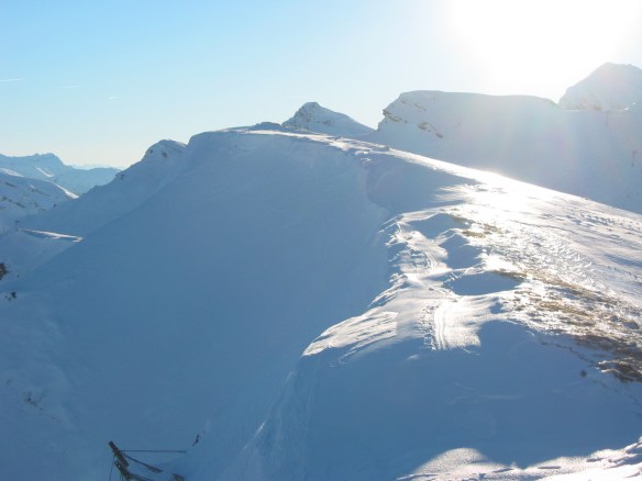 Continuing to head upwards from where the above photo was taken will bring you to the ridgeline which marks the Swiss border with France. Later in the day I skied down the other side into France and ended up in the Morzine valley, where I caught a chairlift back up to the top.