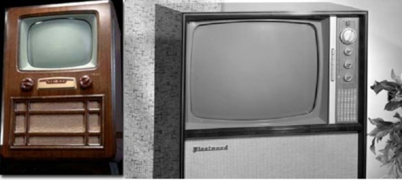 Tarantino lovingly recreates the Hollywood and culture of the late 1960s. The level of detail goes way past the buildings and TV shows and actors of the era, to recreate the look of the vehicles, the advertisements, the furniture etc.  My only quibble is that the TV sets in people’s houses looked bizarrely antique, in ornately polished wooden boxes like the picture below on the left.  My memory of TVs of the 1960s is more like the one on the right.  Possibly, it was only a couple of TVs in the movie, particularly the one in Cliff’s campervan, and maybe he had hung onto an old TV from an earlier time.