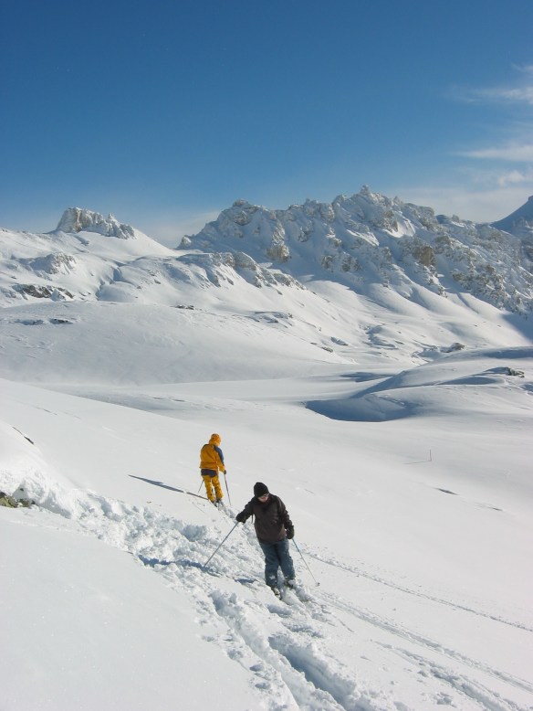 Its starting to turn cold in Geneva, and my thoughts turn towards skiing in the coming winter. I was cleaning up my photo library the other day, and came across some photos from January 2003 of skiing in deep fresh powder snow at Verbier in the Swiss Alps. Verbier is a bit under two hours drive from Geneva and is a renowned ski resort with spectacular scenery and skiing, with many difficult “black” pistes, and extensive off-piste skiing. In the first few years I was in Geneva, Verbier was my regular ski destination, and for a couple of years I rented a small studio apartment there so I could go up for weekends and longer periods when possible. The following photos were all taken in the main ski domain around Atelas (2727 m), La Chaux (2260 m), Fontanet (2485 m), Col des Gentianes (2950 m).