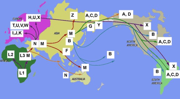 It is thus possible to trace migration routes by observing the branching points in an ancestral map containing all known haplogroups (see map below). Mitochondrial DNA in humans of African origin show the most diversity in the world. This supports the concept that ancient humans first existed in Africa and stayed in Africa for thousands of years. The humans who left Africa around 70,000 years age took two major routes, to Asia (haplogroup M) and to Europe (haplogroup N).