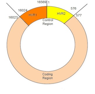 In humans, as in other higher organisms, a DNA molecule consists of two strands that wrap around each other in the well known double helix structure. Each strand contains a linear arrangement of four different bases: adenine (A), thymine (T), guanine (G), and cytosine (C). Specific sequences of three bases make a DNA “word” which codes for an amino acid. A string of DNA “words” strung together in a sequence provides the instructions to make a particular protein. The base-pairs on the circular mtDNA loop are numbered from 1 to 16,569 and different portions of the loop have been given different names as shown in the following diagram. The first and second portions, called hypervariable control region 1 (HRV1) and hypervariable control region 2 (HRV2) are regions of the mtDNA that accumulate mutations (changes in base-pairs) relatively quickly and thus tend to be hyper-variable between people who are not closely related. The third portion, the coding region, accumulates far fewer changes and contains the base-pair sequences for mitochondrial genes [1].