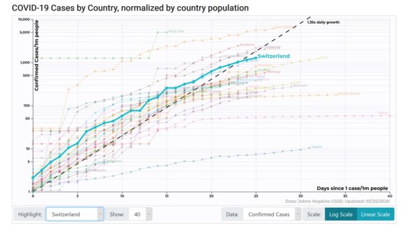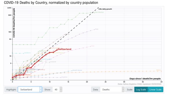 There is also a nice new site http://91-divoc.com/pages/covid-visualization/ that plots time trends in cases and deaths, total numbers and rates per million population. The time axis is days since 100+ cases/deaths or days since 1 case/death per million population. I’ve included screenshots below of cases/million and deaths/million with Switzerland highlighted. The dotted straight line on the log scale represents a daily growth rate of 1.35 (35% more cases than day before). That corresponds to a doubling time of 2.31 days. Fortunately, most curves are showing some flattening after the first 10 days. Australia has a curve that corresponds to a daily growth rate of 1.2. That difference is huge. At a daily growth rate of 1.35, the first case becomes 3.2 million after 50 days, whereas at 1.2 it becomes 9,100.