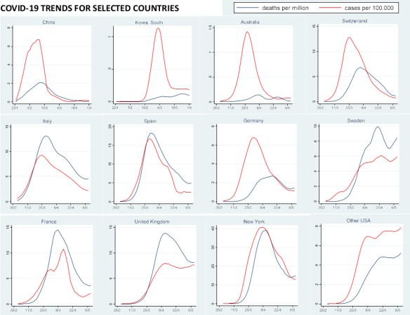 The plots above separate New York and the rest of the USA. The timing and size of the epidemic is different in these, but more importantly, it shows the very different time trends. New York is past its (current) peak and on the way to controlling the epidemic. The rest of the USA has not peaked, and cases and deaths continue to rise. Absolutely not the time to start relaxing social distancing in New York, let alone the rest of the country.