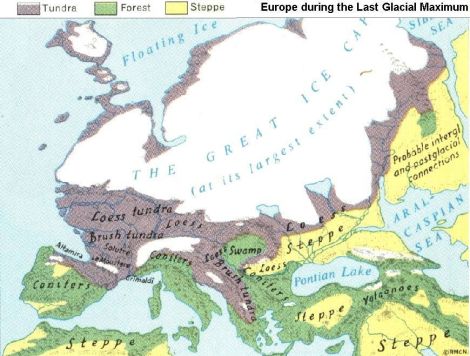 Map shows Palaeolithic Europe 18,000 years ago in the grip of the last ice age. Glacial ice 2km thick covers much of Northern Europe and the Alps. Sea levels are approx. 125m lower than today and the coastline differs slightly from the present day. The air would have been on average 10-12 degrees cooler and much more arid. In between the ice and the tree line, drought-tolerant grasses and dunes would have dominated the landscape.