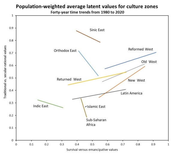 I have also extrapolated time series for these two culture variables across the period 1980-2020 and calculated population-weighted averages for 10 culture zones (as used by Welzel in his recent book Freedom Rising [5].
