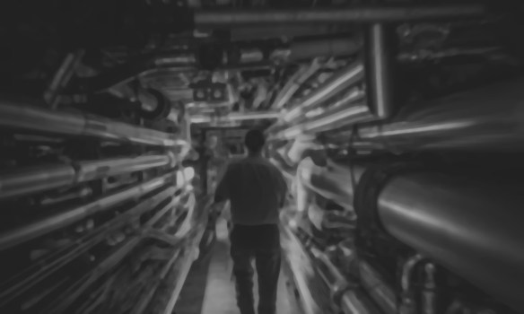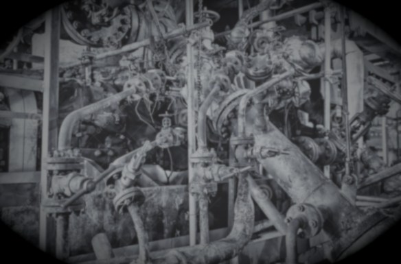 The more complex hallucinations involve me “seeing” the room I am in, even though my eyes are closed. I can look around and see the walls and furniture. And quite often, I discover that the space around me is filled with complex pipes and machinery. In these hallucinations, the lighting is usually very low, not too dissimilar to the actual lighting if I opened my eyes, but enough for me to see what is around me, and the details of the machinery. Here is an example:
