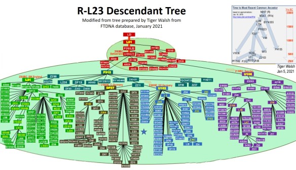Another presentation of the R-L23 descendent tree. My Y-Haplogroup is marked by the blue star.
