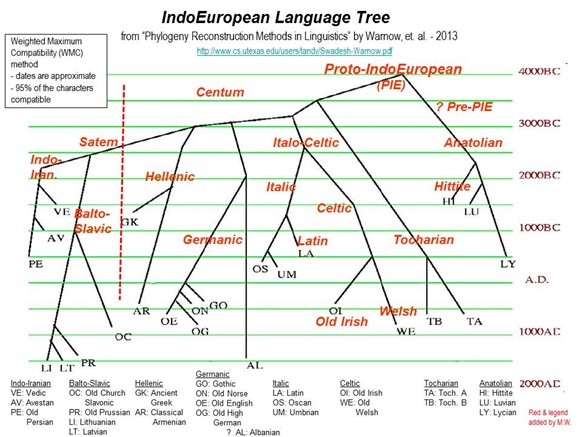 My next haplogroup R-L51 founder lived on the steppe to the west of the Black Sea around 4,100 BCE and spoke early Proto-IndoEuropean (PIE). Over the following two thousand years as the steppe people migrated westward into Europe, regional dialects of PIE evolved into most of the ancient languages of Europe and today most of the native languages of Europe are descended from PIE. Linguists have been able to deduce this evolution from comparisons of grammar and vocabulary and have not only reconstructed the language tree of Europe, but have also reconstructed a version of PIE which it is possible to learn to speak (see website here for self-learning tools). Basque is the only surviving Pre-Indo_European language in Western Europe.