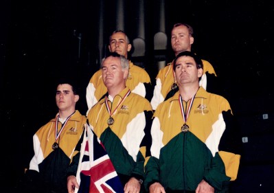 Australian Kata Team at the 1995 World Jujutsu Championships. Front (l to r): Douglas Venables (1st dan), Neil Phillips (3rd dan), John Bear (7th dan). Back (l to r): Colin Mathers (3rd dan), Daniel Parker (1st dan)