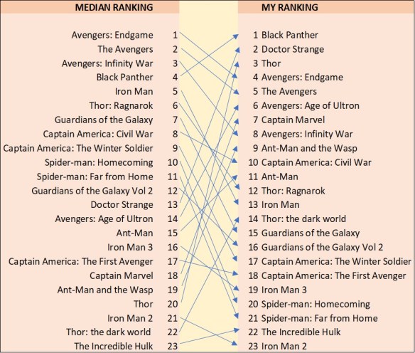 After extensive discussion with my sons, and being unable to convince them of the correct appreciation of the MCU movies, I understand why my rankings for some movies fall outside the range of sampled rankings. Some of my criteria and the weights I give them are quite idiosyncratic and likely quite different to most peoples’. In my next post, I will very briefly comment on each movie and why I gave it the ranking I did.