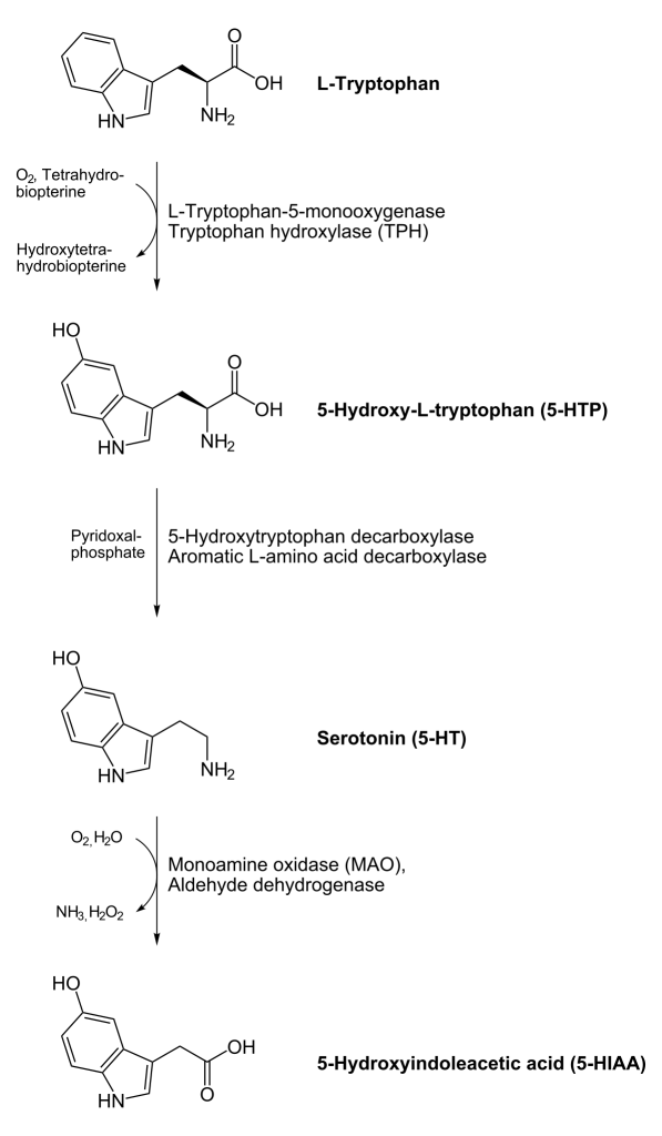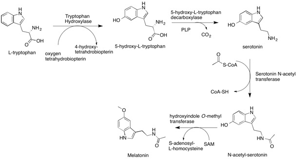 Tryptophan –> 5-Hydroxytryptophan (5-HTP) –> Serotonin –> Melatonin