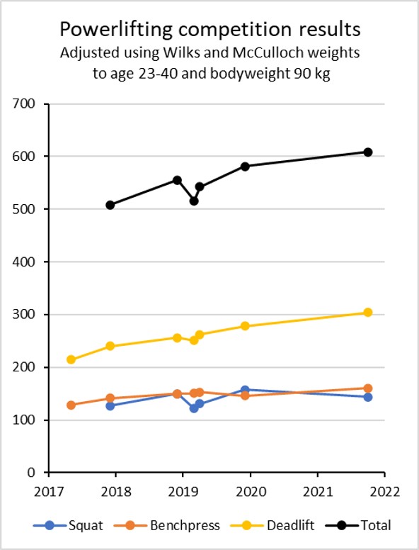 Powerlifting results can be compared across different bodyweight classes using Wilks or Schwartz/Malone weights and age can also be adjusted using McCulloch weights. I used Wilks and McCulloch to calculate the weights that would represent equivalent lifts to mine for a man in the age range 23-40 years with bodyweight 90 kg. These are 144 kg for the squat, 160 kg benchpress and 304 kg deadlift, for a powerlifting total of 608 kg. This represents elite level for benchpress and deadlift, but far from it for the squat. The following graph shows trends over time for my powerlifting competition results, adjusted using Wilks/McCulloch weights to age 23-40 and bodyweight 90 kg. The bench press and deadlift show substantial improvement over time, the squat shows some modest improvement. If I continue to train for competition, squat depth will be a priority.
