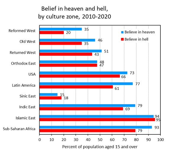 This again illustrates the difference between USA and other developed regions. Belief in heaven and hell in the USA is much higher than in any of the “West” culture zones, or the Orthodox East. But it is quite similar to the levels of belief in Latin America and Sub-Saharan Africa, the two other regions where Christianity is the dominant religion.