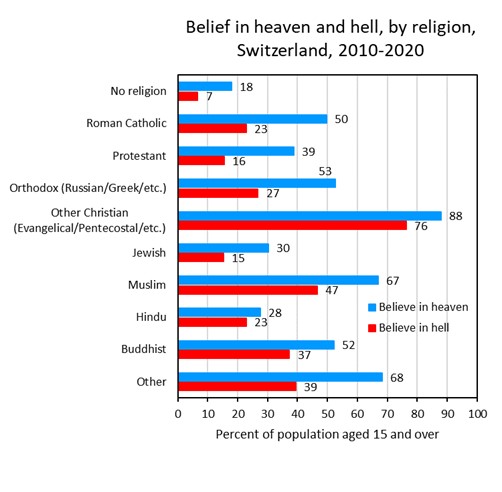 Recently, on social media forums, I’ve seen quite a few questions from Christians asking why aren’t atheists terrified of ending up in hell. And assumptions (mainly from Americans) that belief in hell is the mark of being a Christian. At least in the mainstream media, hell tends to only get a mention as part of the rantings of fundamentalists and religious extremists. These are a tiny minority in Australia and Switzerland. So I decided to see what the data from the World Values Survey (WVS) and the European Values Study (EVS) tell us about the prevalence of belief in heaven and hell.