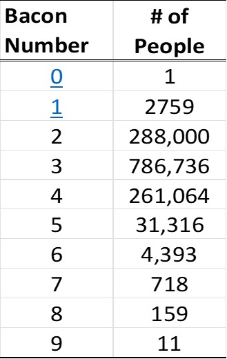 An astonishing 2,759 actors have appeared in movies with Kevin Bacon. The average Bacon number 3.03 and only 888 of the 1,375,157 actors had a Bacon number of 7 or greater, that’s less than 0.1%.