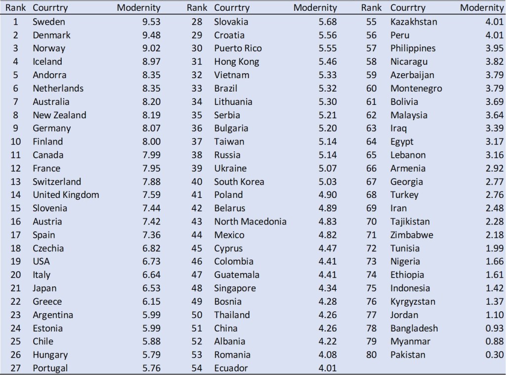 The latent variable has been scaled so that average values for countries ranged from just above zero to slightly below 10. Higher values denote higher prevalence of modern values. The following table ranks countries in descending modernity of values based on estimates for waves 5 to 7 of the IVS, covering years 2005 to 2020.