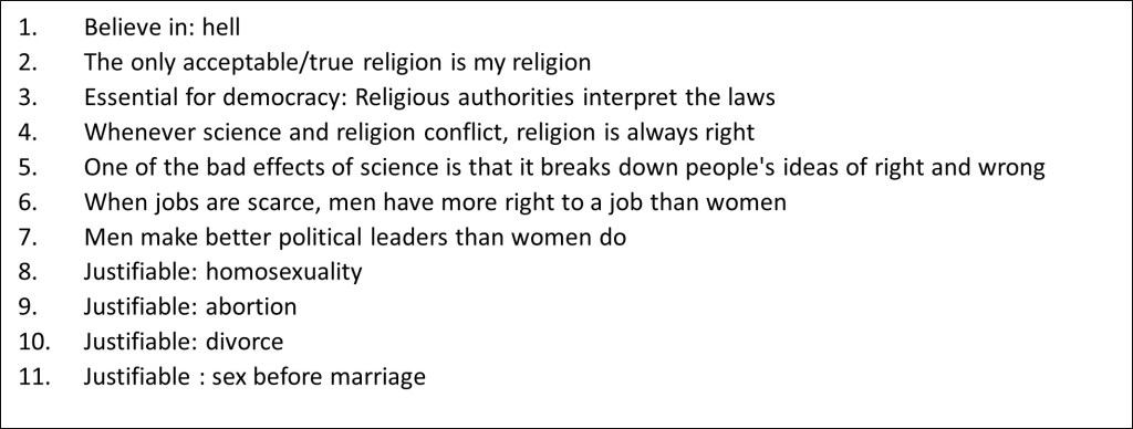 To examine variations in pre-modern versus modern values across countries and time, I estimated a continuous latent variable “modernity” based on responses to 11 selected questions in the IVS (see following box) whose responses will vary depending on how modern or pre-modern the respondent’s values are. which assumed there is an unobserved underlying continuous variable that describes the individual’s level of modernity of values and predicts (or correlates with) their answers to specific values questions. I used general linear modelling methods to estimate a continuous latent variable “modernity” from the responses to the 11 selected values questions. See here for more details.