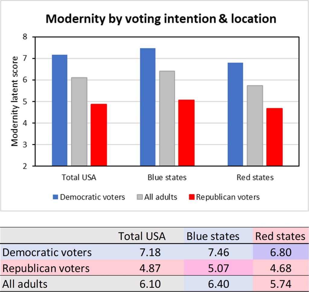 It’s clear that Democrat voters have higher modernity scores that Republic voters, and that Democrat and Republic voters have lower modernity scores in Red states than in Blue states. Average modernity scores for Red and Blue states differ by less than average modernity scores for Democrat and Republican voters because the average scores for the state groups is an average across both Democrat and Republican voters. Given the first-past-the-post nature of most US elections, the modernity levels of Democrat voters in Blue states and Republican voters in Red states is a better measure of the real difference in modernity between the Red and Blue states.
