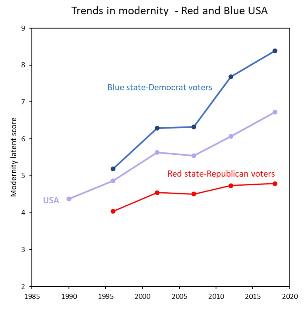 The average modernity value for the USA is 6.73, a similar level to that of Spain, Italy, and Japan. US surveys from 1995 onwards included the location of the interview (region or state) and a question “Which political party would you vote for (first choice)?” with 80% of respondents answering Democrat or Republican. I classified location of interview as either “Blue State” or “Red State” based on State votes in Presidential elections from 2000 onwards as reported by Wikipedia.