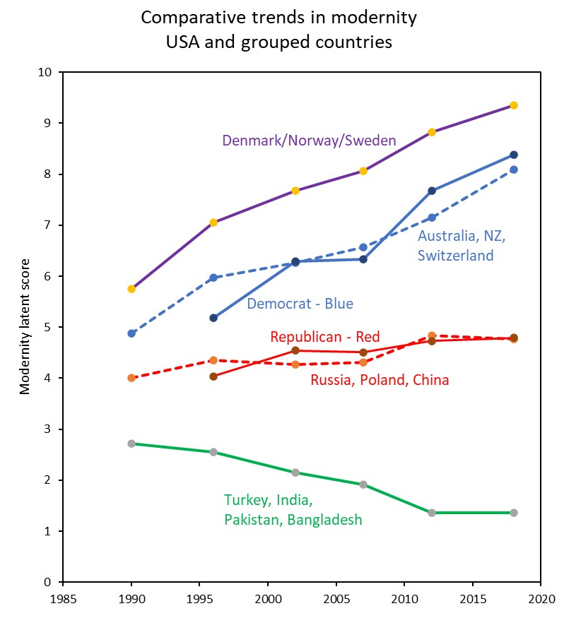 Blue-Democrats have followed a very similar trajectory to the average of Australia, New Zealand and Switzerland over the last three decades, with relatively rapidly rising levels of modernity. This puts them very much in the company of modern Western secular states. In contrast, the Red-Republicans level of modernity tracks closely the average for Russia, Poland, and China, and currently falls about halfway between that of China and Russia. This might help to explain why they are quite happy for their cult leader Trump to openly admire and express support for Putin and other dictators and despise the leaders of the democratic countries of Europe.