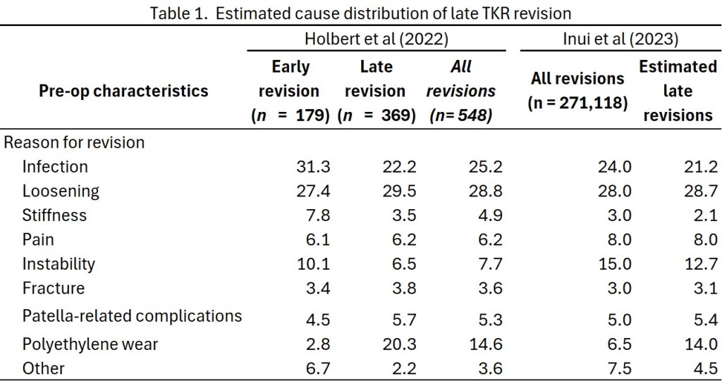 Inui et al (2023) analysed causes of TKR failure in 271,118 TKRs using data from national registries of 11 countries. Holbert et al (2022) examined the cause distribution of TKR failure for early (<=2 years) and late (>2 year) revisions in 548 patients who underwent revisions in a single hospital. The overall cause distribution was very similar to that found by Inui et al (2023), so I have used the combined data to estimate the cause distribution of late revisions in the Inue dataset (see Table 1).