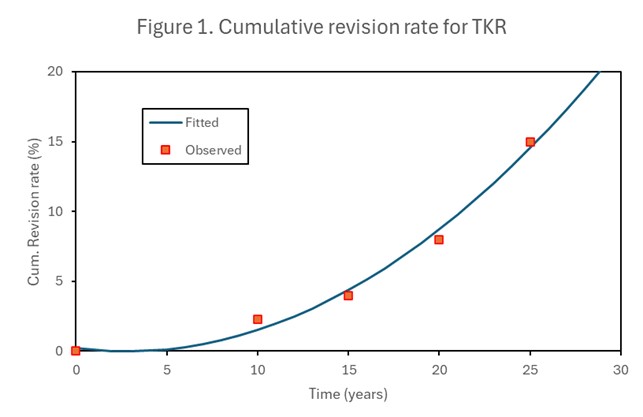 For the following calculation, I will take the higher wear estimate of an additional 2% associated with the powerlifting training program described above. The regression equation I derived for the cumulative revision rate of TKR in Section 2 gives a revision rate of 8.72% at 20 years.