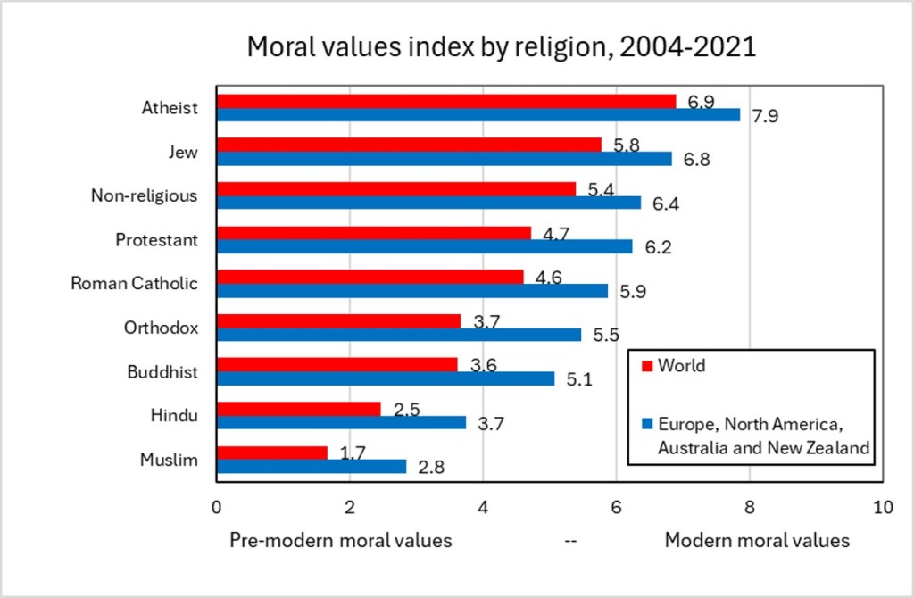 The figure below shows the average moral values index for atheists, non-religious people, and for religious people by religion. Averages for the world and for Europe, North America, Australia and New Zealand (as a group) are shown. Its clear that Atheists have the highest moral values score, followed by Jews and non-religious. At the other end of the scale, Hindus and Muslims have the lowest level of modern moral values.